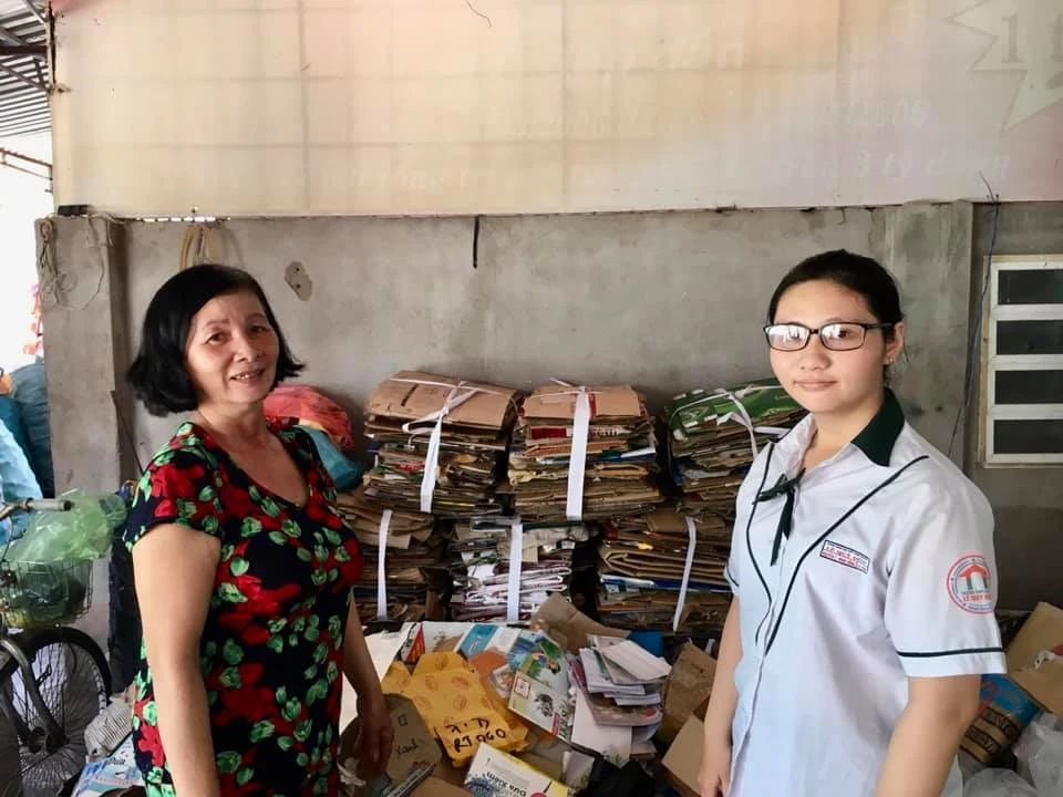 Nguyễn Thị Minh Hồng cùng mẹ của em bên những chồng ve chai. Ảnh: CTV