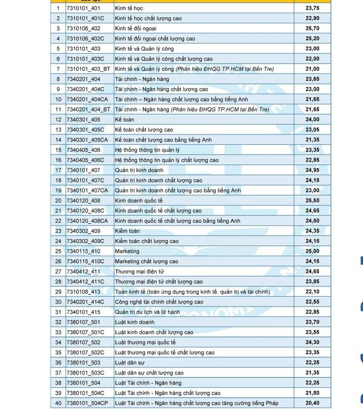 Theo đó, điểm trung bình trúng tuyển vào trường là 24,13 điểm, trong đó, điểm trung bình trúng tuyển khối ngành Kinh tế là 24,02 điểm, khối ngành Kinh doanh & quản lý là 24,38 điểm và khối ngành Luật là 23,51 điểm.