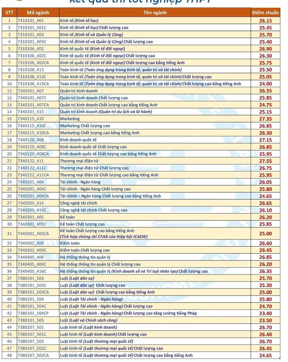 Theo thống kê của trường, điểm trung bình trúng tuyển năm 2022 là 26,36. Trong đó, điểm trung bình khối ngành Kinh tế là 26,22 điểm, khối ngành Kinh doanh là 26,64 điểm và khối ngành Luật là 25,65 điểm. Đây là tổng điểm của 3 môn trong tổ hợp xét tuyển A00, A01, D01 và D07 đối với học sinh THPT khu vực 3 và không nhân hệ số.