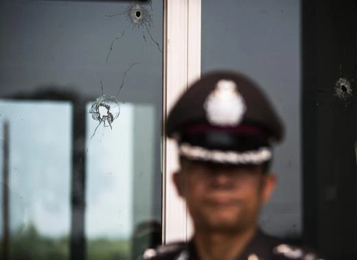 Viên cảnh sát đứng cạnh vết súng bắn trước nhà ông Kwanchai Praipana, . Ảnh : Reuters