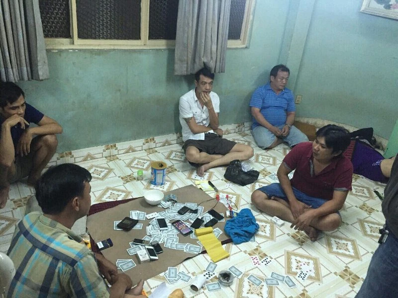 Kiểm tra lầu một của ngôi nhà, cơ quan công an phát hiện tám nghi can đang tham gia đánh bạc gồm: Trần Văn Quân, Phan Tấn Khởi, Lê Đồng Hà, Dương Huy Tuấn, Mai Văn Long, Nguyễn Thanh Phong, Trương Văn Ngọc và Nguyễn Thị Bích Liên.