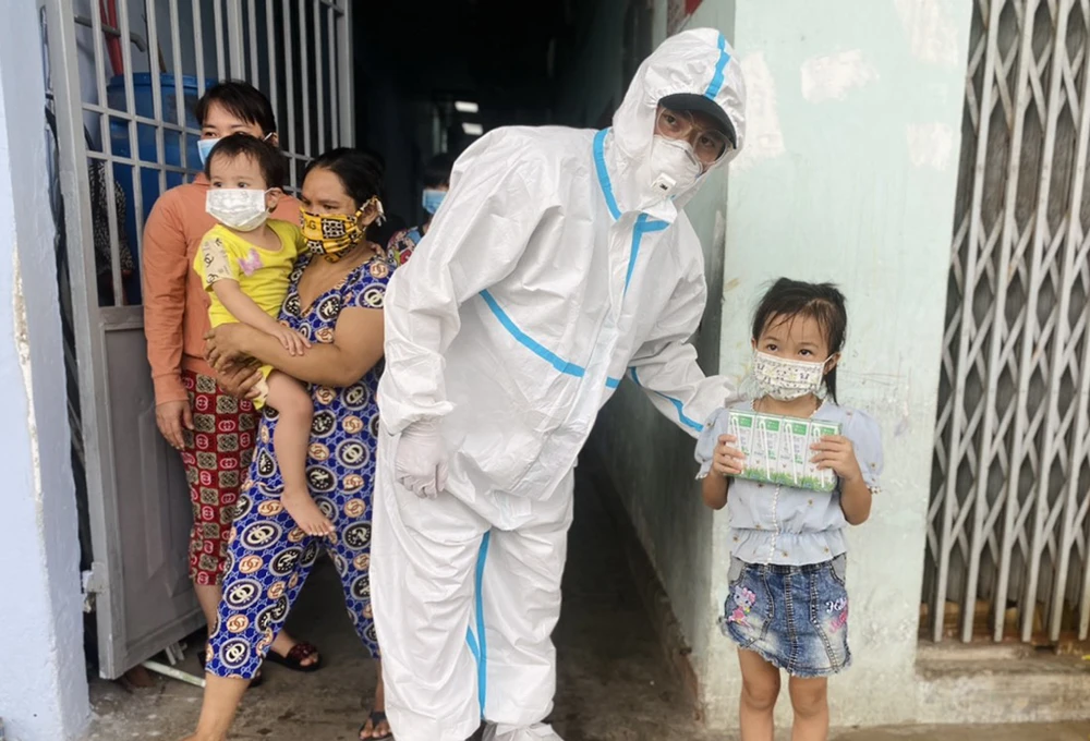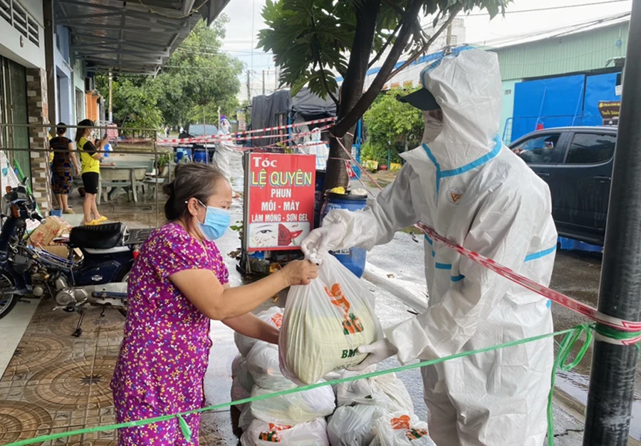 Theo lịch trình trong ngày, nhóm đi phát hơn 2.000 phần quà cho người dân có hoàn cảnh khó khăn trong vùng đỏ tại thị xã Dĩ An, tỉnh Bình Dương.