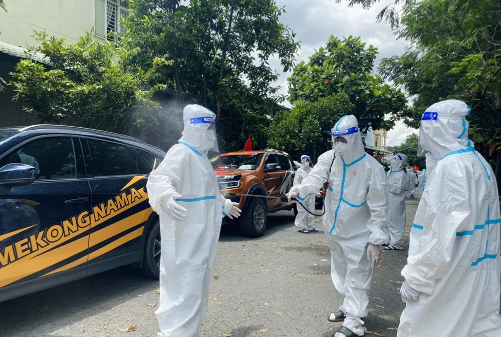 Tiến Dũng thực hiện phun khử khuẩn sau mỗi lần phát quà cho dân và trước khi di chuyển qua địa điểm khác. Ảnh: PHAN NHUNG