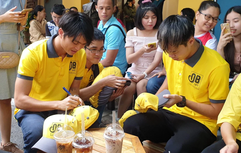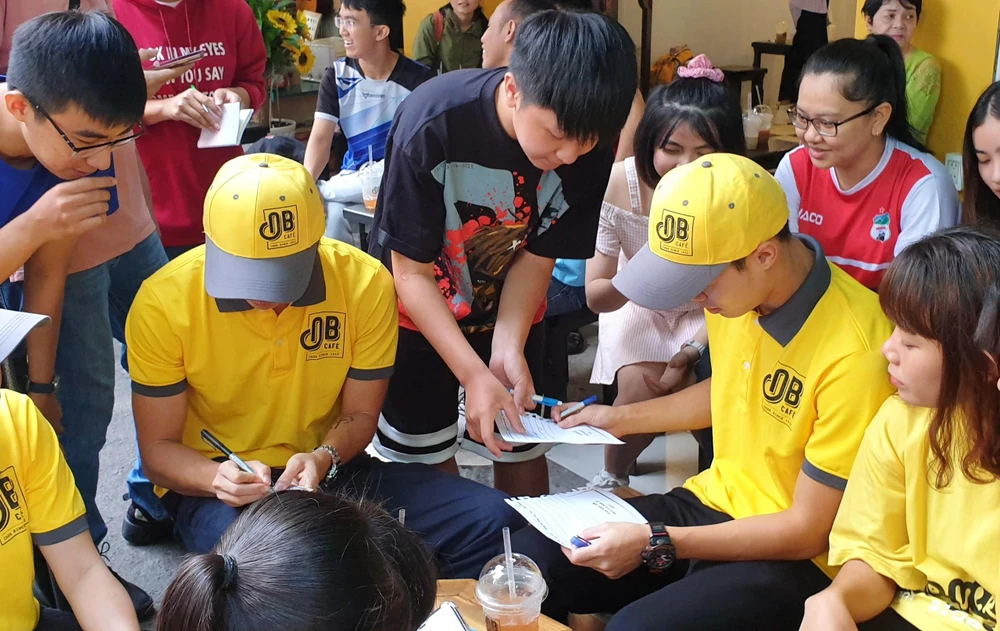 Những bạn trẻ yêu bóng đá rất hạnh phúc khi gặp gỡ hai cầu thủ HA Gia Lai khoác áo đội tuyển quốc gia...