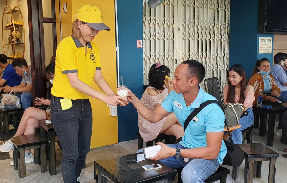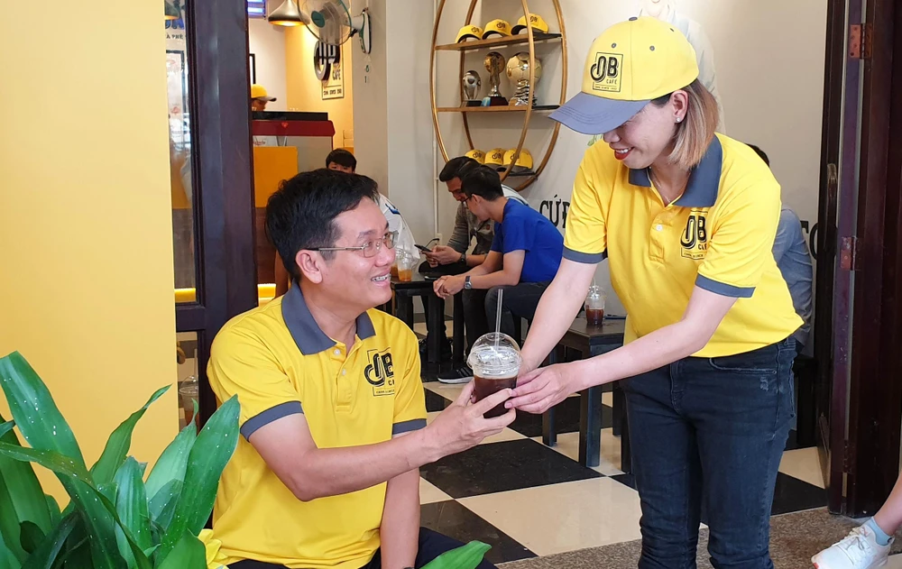 Tuấn Anh và Văn Toàn nhiệt tình giúp đỡ đồng nghiệp đàn chị phục vụ quán trong ngày khai trương 30-5...