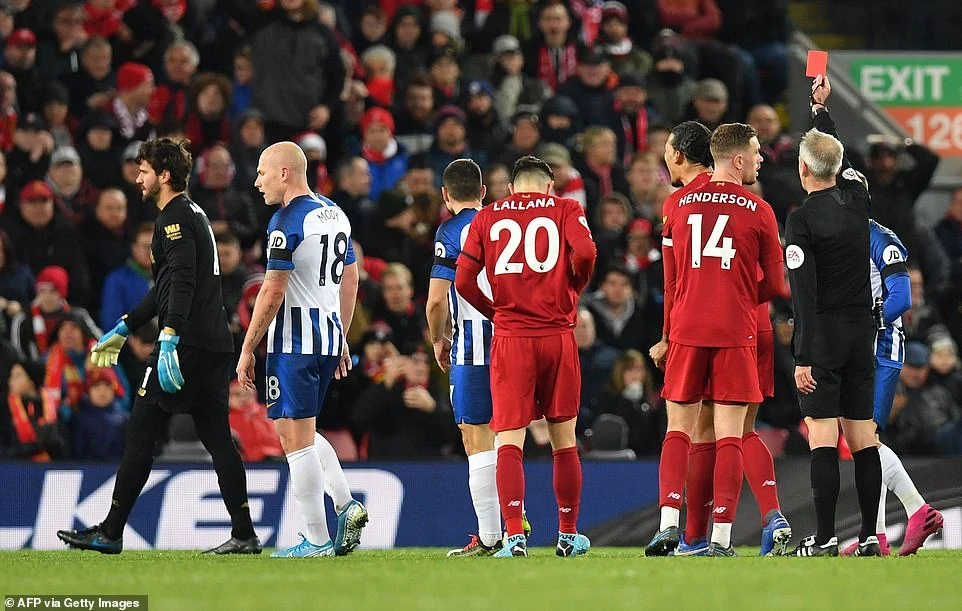 Liverpool gặp khó khi mất thủ môn Alisson nhận thẻ đỏ do lỗi chơi bóng bằng tay ngoài vòng cấm.