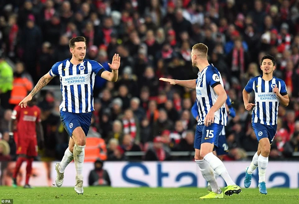 Lewis Dunk chớp thời cơ ghi bàn rút ngắn tỷ số còn 1-2 cho Brighton.