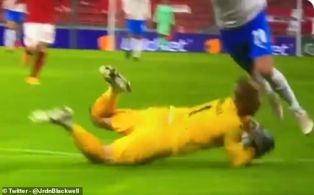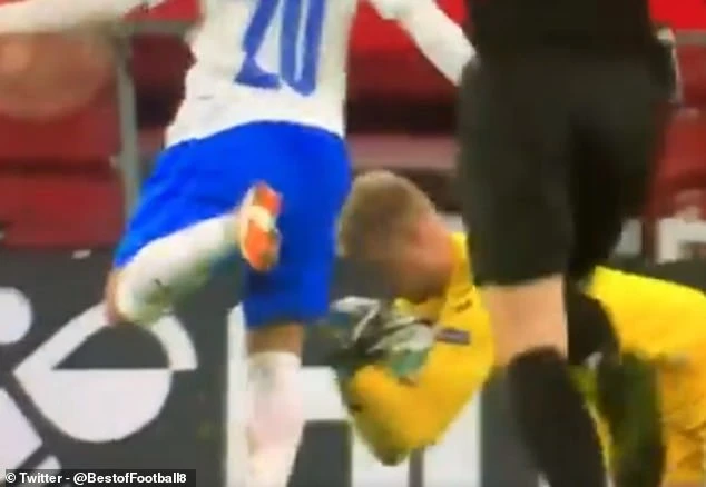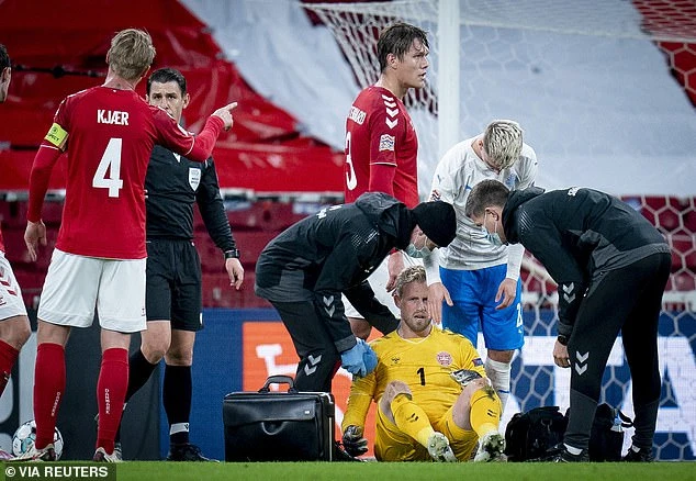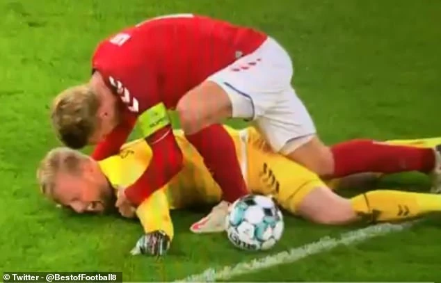 Schmeichel ngã vật ra sân đau đớn với đôi mắt nhắm nghiền. Đồng đội của Schmeichel lập tức lao đến xem xét tình hình, còn đội ngũ y tế cũng nhanh chóng vào cuộc sơ cứu cho Schmeichel.