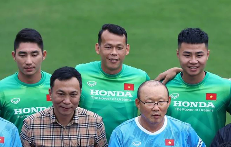 Tấn Trường (đứng giữa, hàng sau) giờ là lựa chọn số 1 ở vị trí thủ môn thi đấu tại UAE. Ảnh: VFF