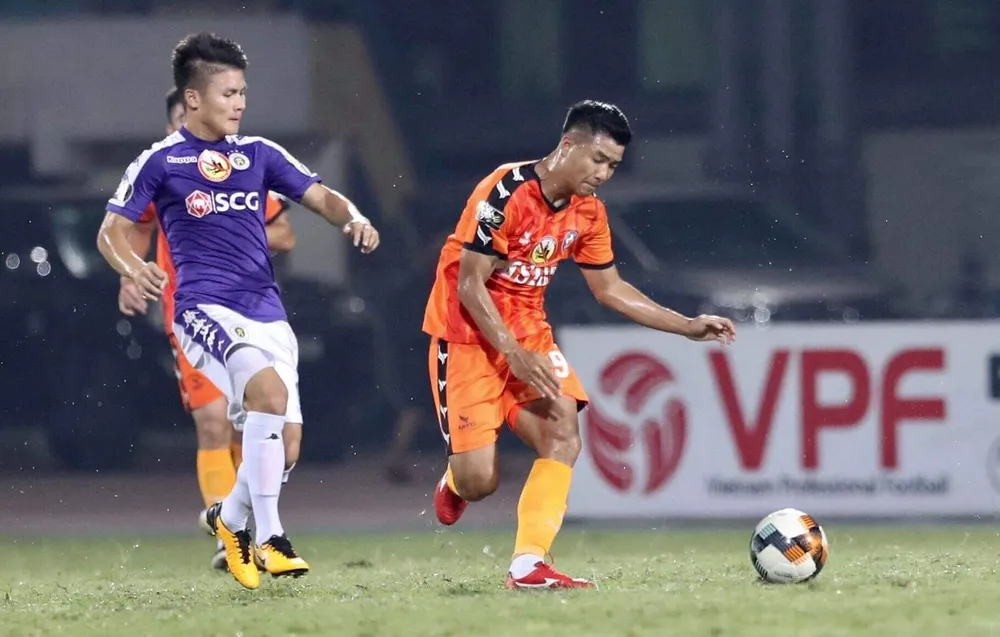 Tiếc cho cán cân lực lượng giữa hai đội không tương xứng giữa một bên Quang Hải (trái) có nhiều vệ tinh thiện chiến, còn Đức Chinh không may bị chấn thương vẫn vào sân cày ải.