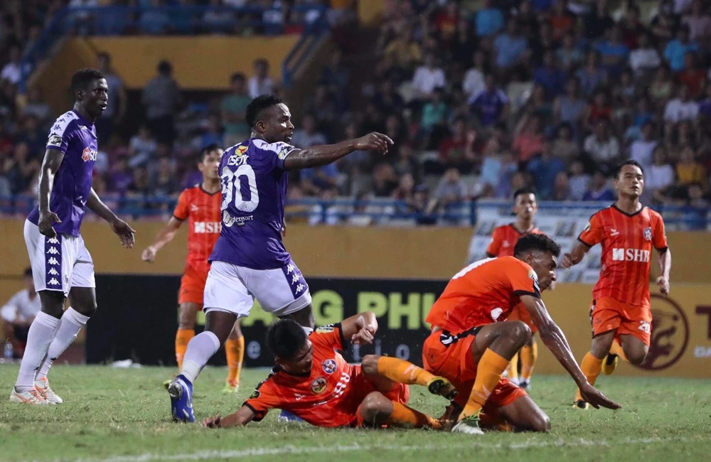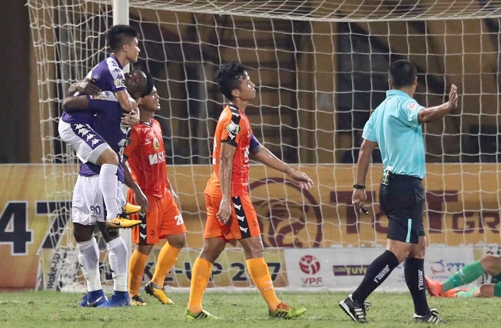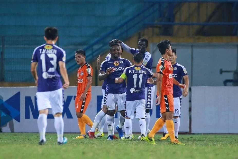 Hàng thủ hớ hênh của SHB Đà Nẵng không thể ngăn Oseni ghi bàn giúp cho Hà Nội dẫn trước 2-1.