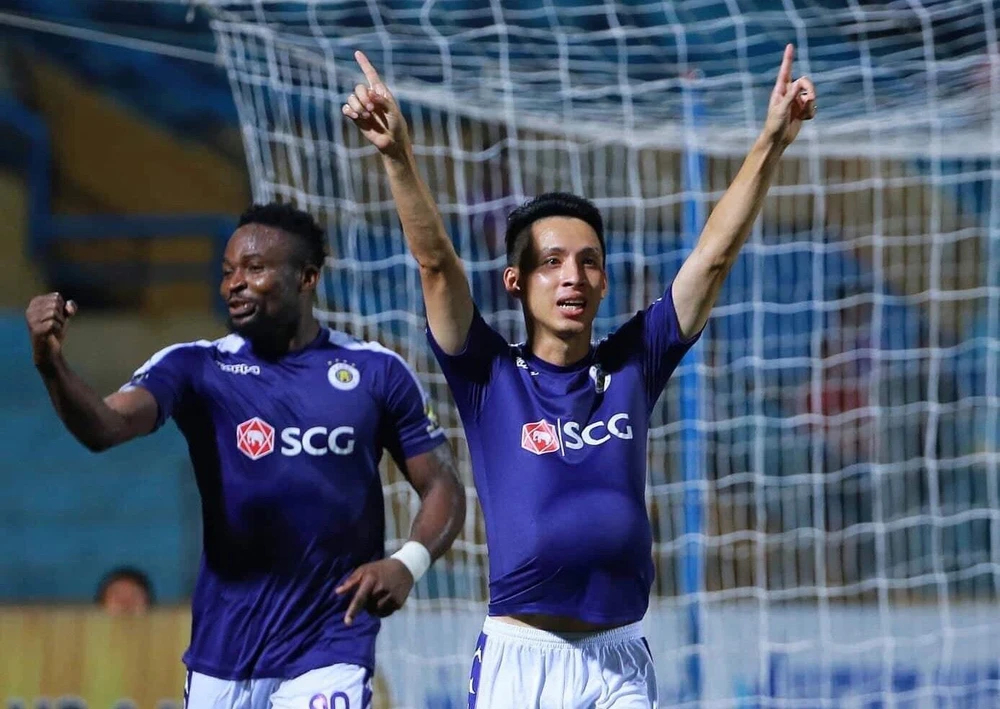 Ngoại binh Oseni ghi bàn mở điểm cho Hà Nội ở phút 28 sau hàng loạt pha hãm thành dữ dội.