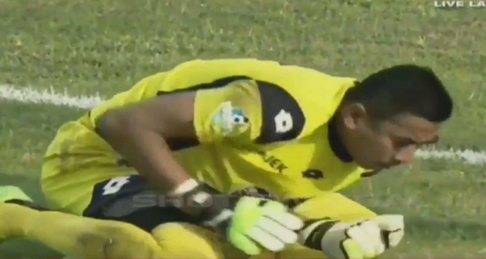 Cú va chạm dẫn đến thủ môn Huda (áo vàng) tổn thương đầu nặng.