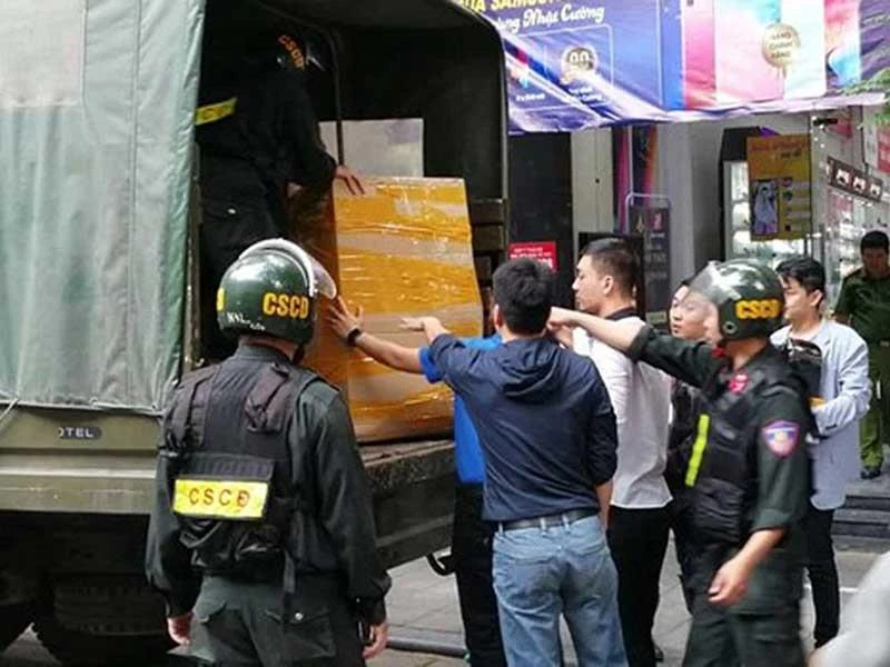 Cảnh sát thu giữ nhiều tang vật sau khi khám xét cơ sở của Nhật Cường Mobile. Ảnh: T.PHAN