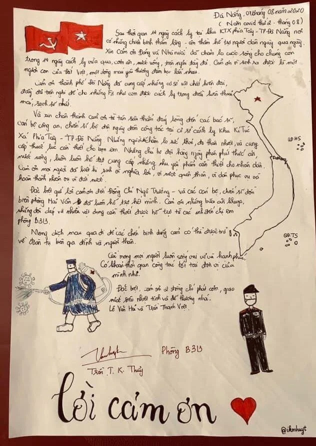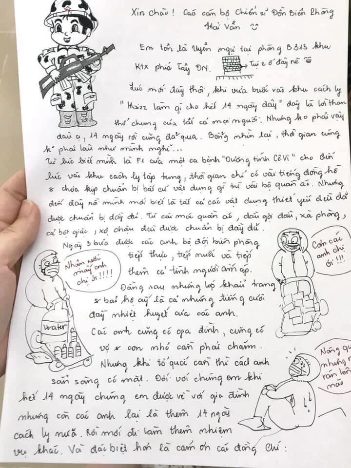 Các chiến sĩ bộ đội làm nhiệm vụ tại khu cách ly Ký túc xá (KTX) phía Tây TP Đà Nẵng (quận Liên Chiểu) liên tiếp nhận được những bức thư tay từ những người hết hạn cách ly 14 ngày.