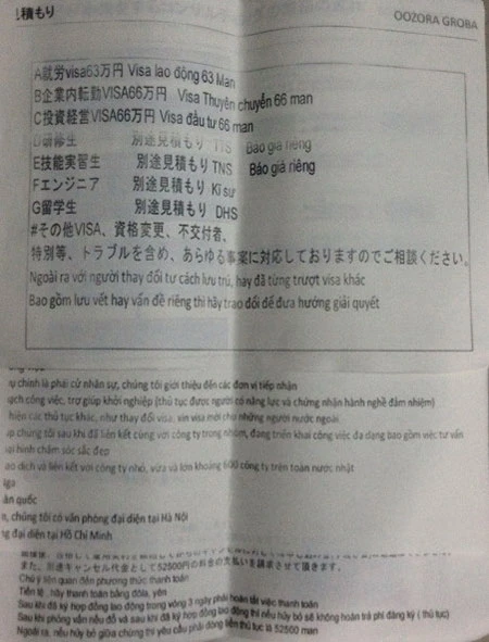 Chị H., một người trong nhóm, cho biết do có quen biết nên chị đã nhờ Trang gửi đứa cháu tên là VĐL (quê Nghệ An) sang Nhật theo dạng visa đầu tư, dự kiến sẽ xuất cảnh vào cuối tháng 4. Giữa tháng 11-2013, L. cùng người nhà và Trang đến văn phòng của Công ty Oozora Global tại TP.HCM để đóng 12.000 USD tiền cọc và 2.000 USD (tạm gọi là phí ban đầu). Riêng khoản tiền 12.000 USD được bộ phận thu tiền giải thích là tiền cọc sẽ được trả lại cho người lao động. “Từ khi đóng tiền đến nay đã bốn tháng nhưng cháu tôi vẫn chưa biết mặt mũi cái visa đầu tư nó như thế nào”- chị H. than thở.