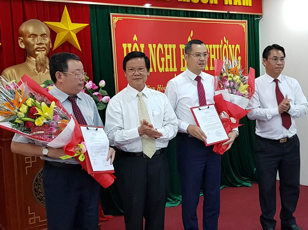 Ông Hà Ban, Phó Ban Tổ chức Trung ương (thứ hai từ trái sang), trao quyết định của Ban Bí thư cho ông Hoàng Văn Trà (bìa trái) và ông Phạm Đại Dương (thứ ba từ trái sang).