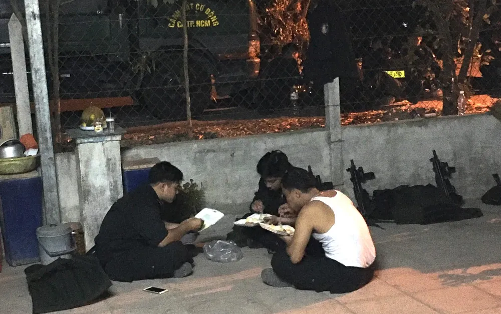 Các Cảnh sát cơ động tranh thủ ăn tối để tiếp tục làm nhiệm vụ. Ảnh: N.YÊN