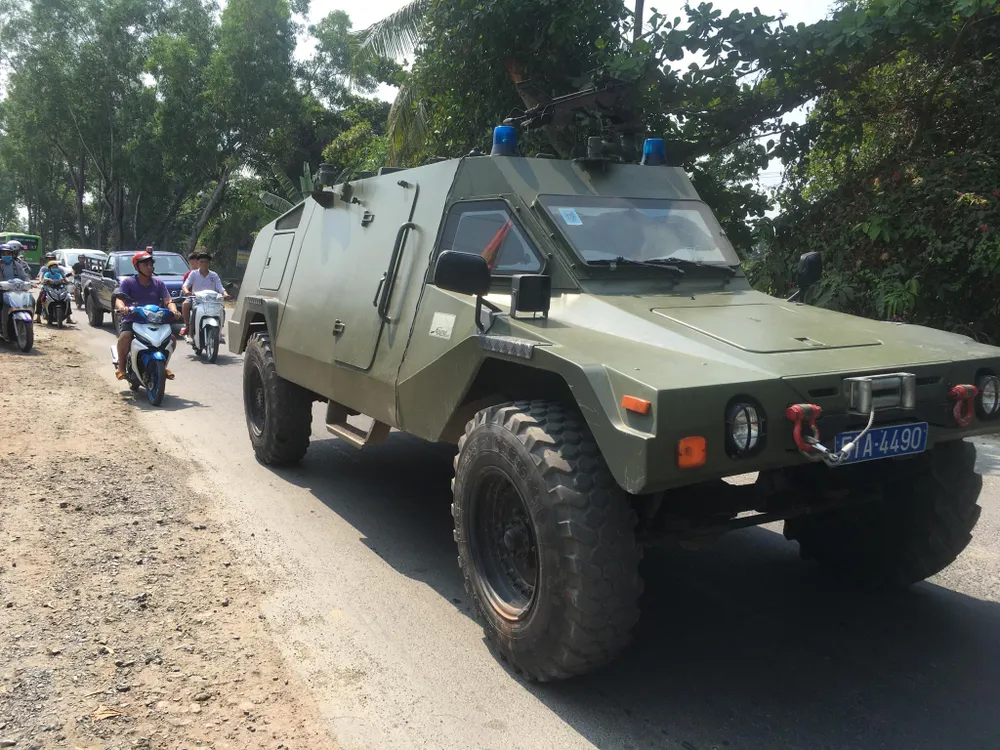Xe bọc thép đi chuyển về hướng nghi có kẻ sát nhân lẩn trốn. Ảnh: N.YÊN