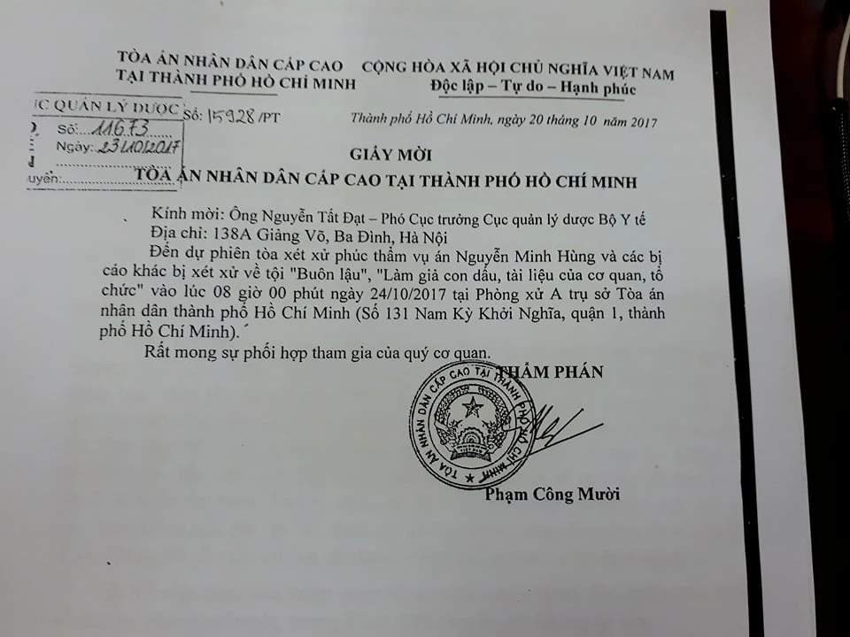 Về việc nhiều tờ báo đã đăng tải thông tin tòa án triệu tập cán bộ Cục Quản lý dược: Lãnh đạo Bộ Y tế, Cục Quản lý dược - Bộ Y tế có nhận được “giấy mời” chứ không phải giấy triệu tập của TAND Cấp cao tại TP.HCM đến tham dự phiên tòa. Cụ thể, Cục Quản lý dược chỉ nhận được hai giấy mời có tên trực tiếp là giấy mời cho ông Nguyễn Tấn Đạt và ông Phan Công Chiến, còn lại là một giấy mời đại diện lãnh đạo Cục.