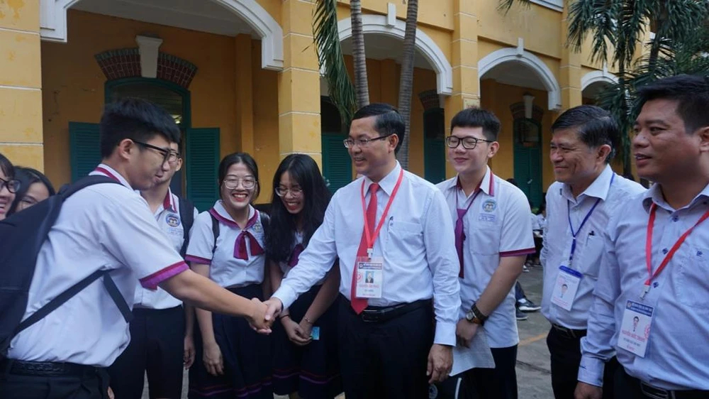 Thứ trưởng Nguyễn Văn Phúc bắt tay, chúc các sĩ tử thi tốt tại điểm thi THPT Trưng Vương, quận 1.