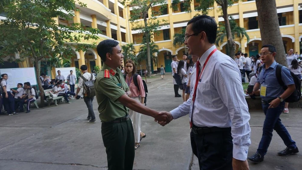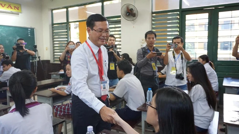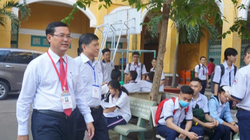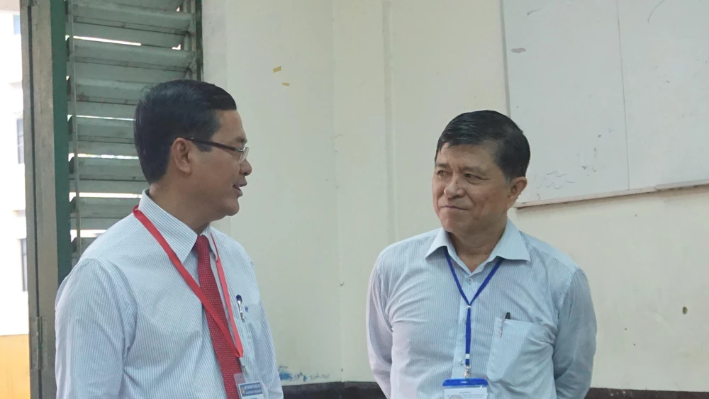 Ông Nguyễn Văn Phúc, Thứ trưởng Bộ GD& ĐT cùng ông Nguyễn Văn Hiếu, Phó Giám đốc Sở GD&ĐT TP.HCM kiểm tra công tác thi tại trường.