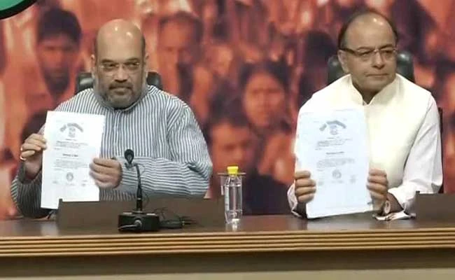 Hai lãnh đạo đảng BJP Amit Shah và Arun Jaitley công bố bằng cấp của Thủ tướng Modi ngày 9-5. (Ảnh: NDTV)