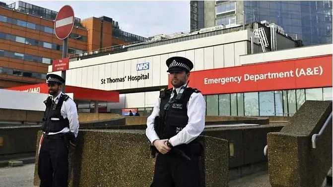 Các sĩ quan cảnh sát đứng bên ngoài Bệnh viện Saint Thomas, nơi Thủ tướng Boris Johnson vẫn đang được điều trị tích cực (ICU). Ảnh: AP