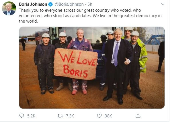 "Cảm ơn tất cả mọi người trên khắp đất nước đã bỏ phiếu, các tình nguyện, ứng cử viên. Chúng ta đang sống trong một nền dân chủ tuyệt vời nhất trên thế giới" - ông Johnson viết trên Twitter.