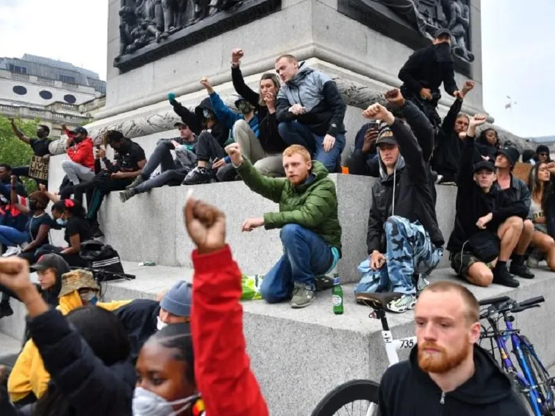 Người dân Anh biểu tình quỳ ở Quảng trường Trafalgar (London) phản đối việc cảnh sát Mỹ giết người đàn ông da màu George Floyd. Ảnh: REUTERS