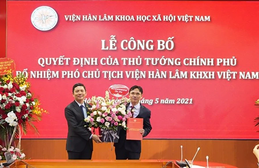 Phó Giáo sư, Tiến sỹ Bùi Nhật Quang, Chủ tịch Viện Hàn lâm KHXH Việt Nam trao Quyết định cho tân Phó Chủ tịch Viện Hàn lâm Nguyễn Đức Minh (phải). Ảnh: Dangcongsan.vn