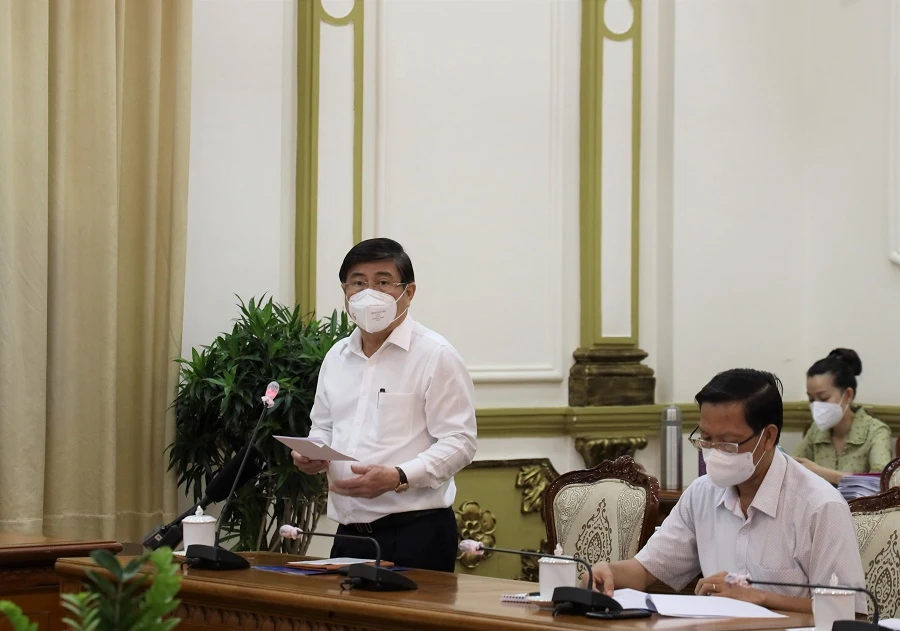 Chủ tịch UBND TP.HCM Nguyễn Thành Phong báo cáo tại buổi họp. Ảnh: TTBC