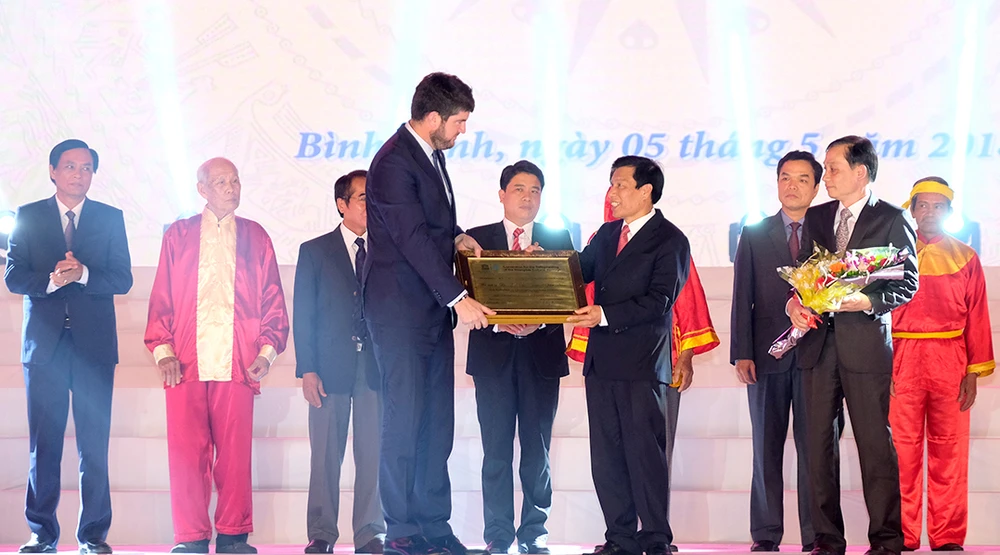 Ông Michael Croft, Trưởng đại diện Văn phòng UNESCO tại Việt Nam trao bằng ghi danh cho Bộ trưởng Bộ VH-TT&DL. Ảnh: CTV