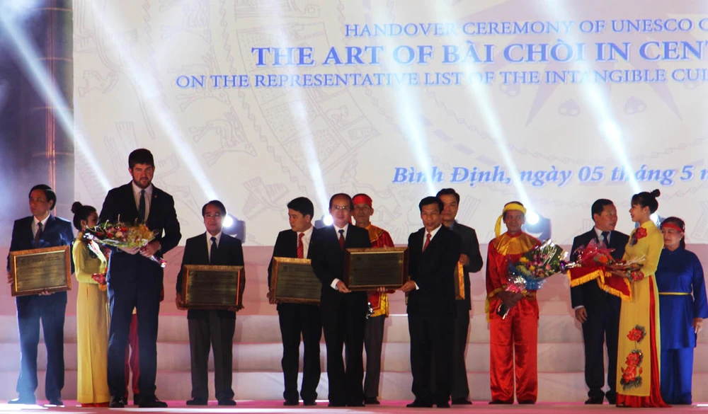 Tối 5-5, lễ đón bằng của Tổ chức Giáo dục - khoa học - văn hóa của Liên hợp quốc (UNESCO) ghi danh nghệ thuật bài chòi Trung bộ Việt Nam là di sản văn hóa phi vật thể đại diện của nhân loại diễn ra tại TP Quy Nhơn (Bình Định).