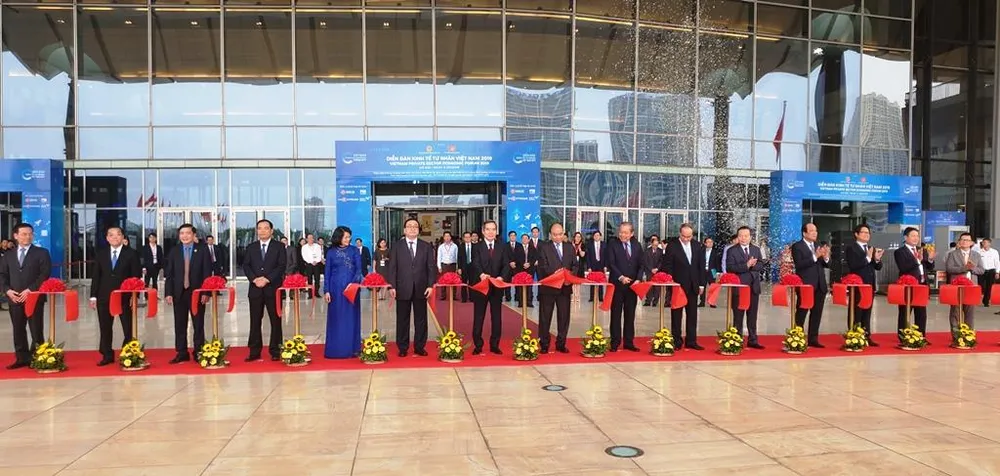 Trước khi vào phiên toàn thể Diễn đàn kinh tế tư nhân Việt Nam 2019, Thủ tướng và các lãnh đạo Đảng, Nhà nước... cắt băng khai trương Triển lãm thành tựu kinh tế tư nhân Việt Nam.