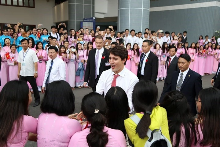 Thủ tướng Canada Justin Trudeau giữa vòng vây sinh viên ĐH Tôn Đức Thắng.