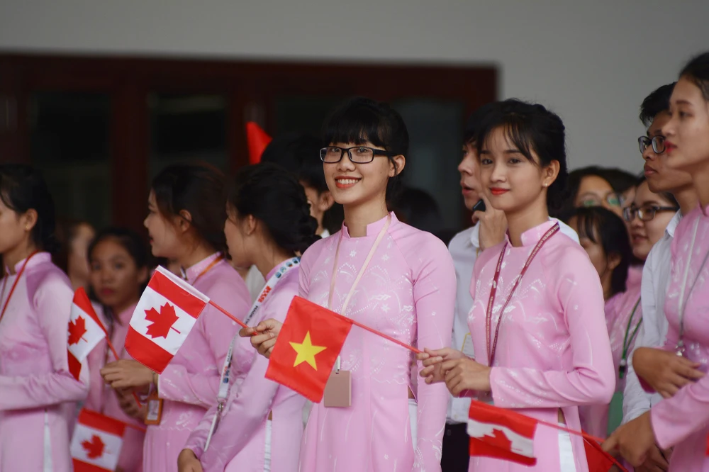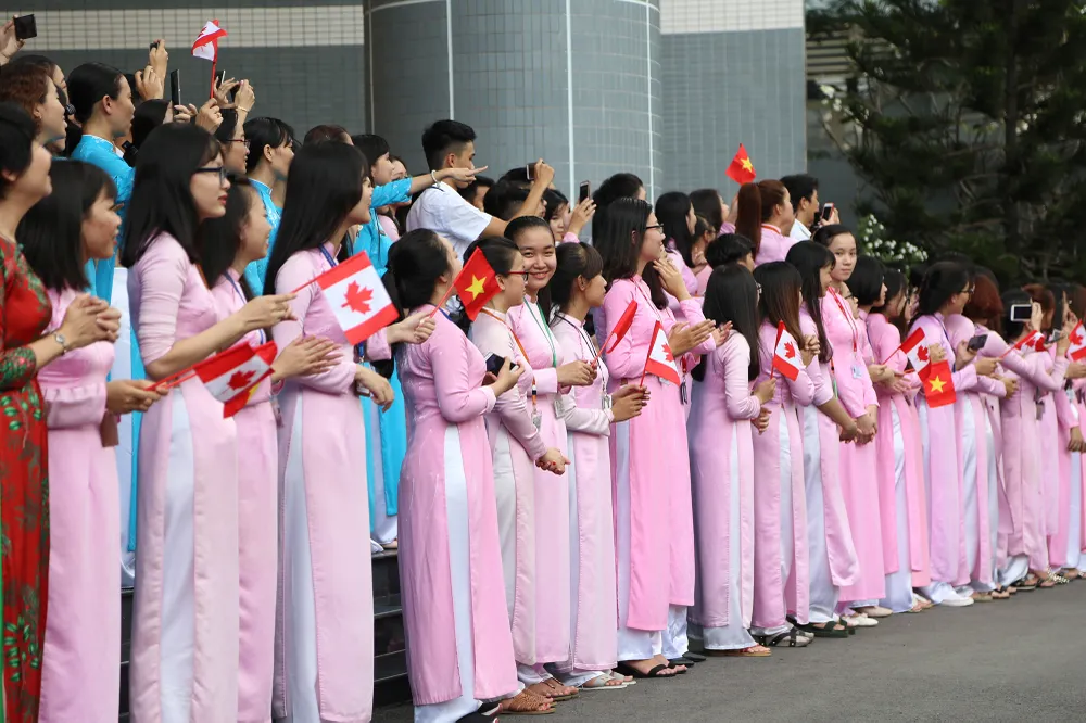 Sinh viên diện áo dài và cầm cờ chào đón thủ tướng Canada đến thăm và gặp gỡ sinh viên của trường.