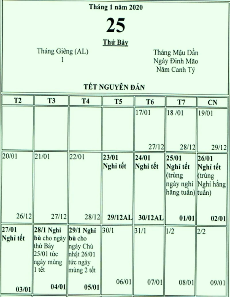 Lịch nghỉ Tết Nguyên đán Canh Tý 2020.