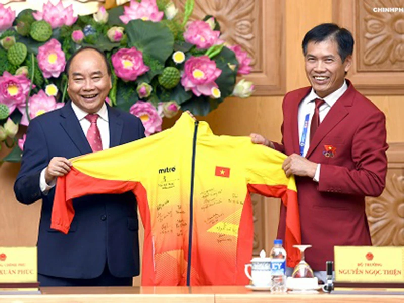 Thủ tướng nhận quà là chiếc áo đồng phục của đoàn thể thao Việt Nam có chữ ký của các vận động viên đoạt huy chương tại Asiad. Ảnh: VGP