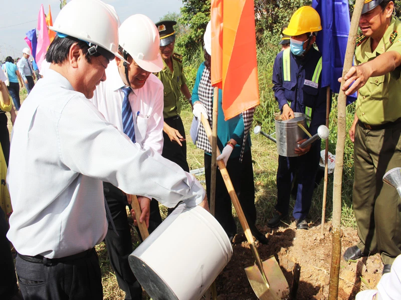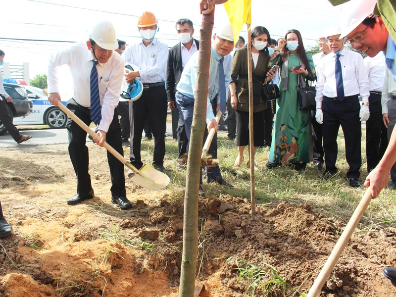 Bến Tre trồng những cây xanh đầu tiên tại lễ phát động trồng 10 triệu cây xanh trên địa bàn tỉnh. Ảnh: ĐH