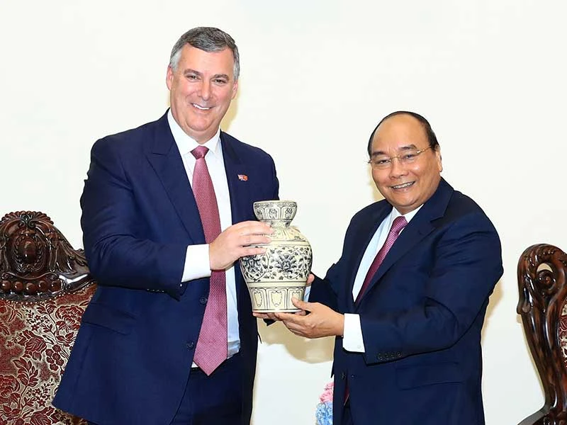 Thủ tướng Nguyễn Xuân Phúc tặng quà lưu niệm cho ông Kevin McAllister, Chủ tịch kiêm Tổng Giám đốc Công ty Boeing Thương mại (Hoa Kỳ). Ảnh: TTXVN
