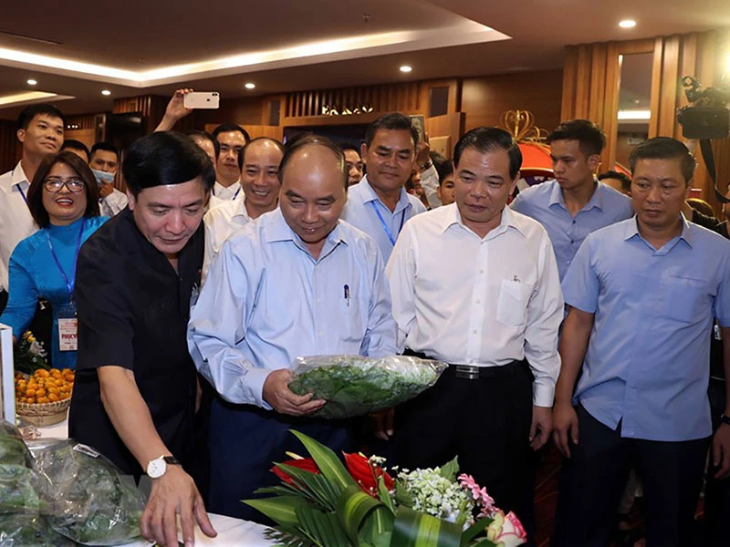 Thủ tướng Nguyễn Xuân Phúc thăm các gian trưng bày nông sản tại hội nghị. Ảnh: TTXVN
