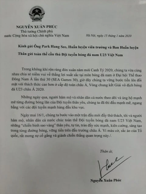 Bức thư động viên đội U-23 Việt Nam của Thủ tướng Nguyễn Xuân Phúc.