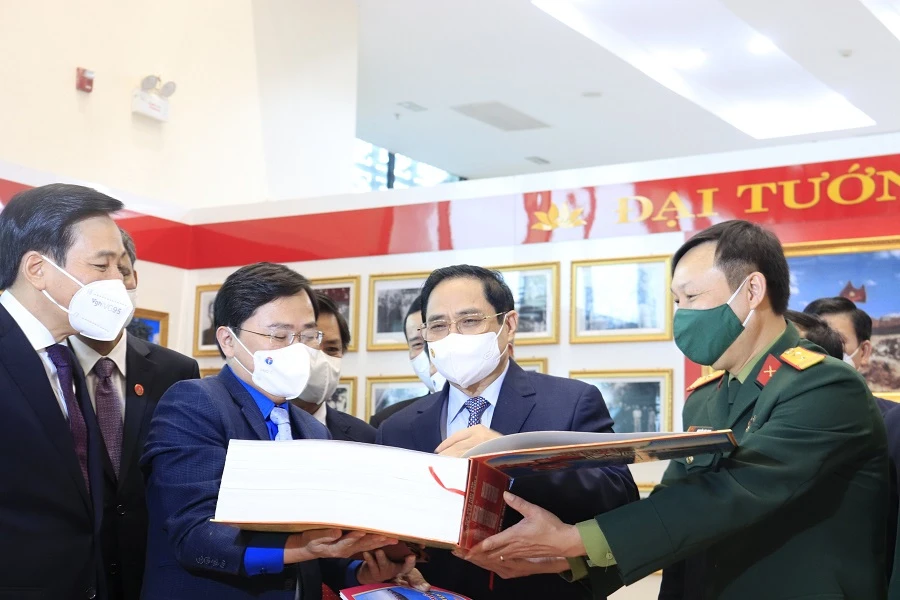 Ngay trước lễ kỷ niệm, Thủ tướng Phạm Minh Chính cùng các đại biểu cũng tham quan triển lãm về cuộc đời và sự nghiệp của Đại tướng Võ Nguyên Giáp.