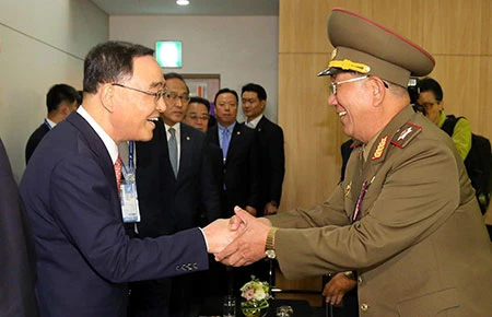 Chủ nhiệm Tổng cục Chính trị Hwang Pyong-so (phải) bắt tay Thủ tướng Chung Hong-won tại lễ bế mạc Asiad 17. Ảnh: AP