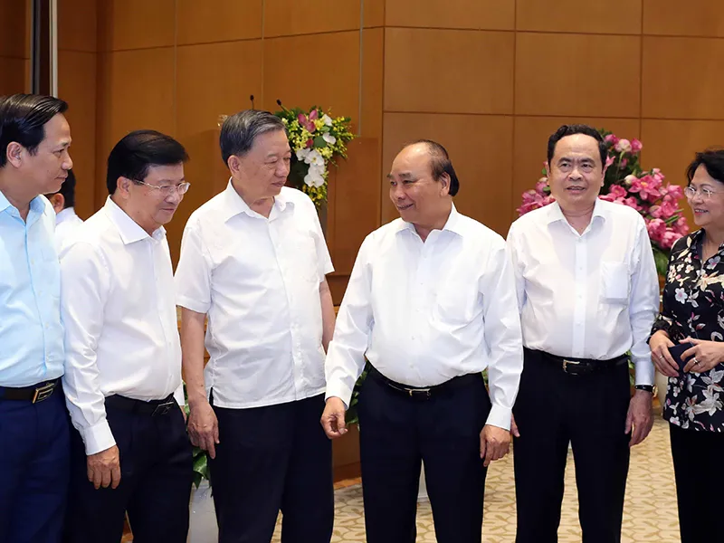 Thủ tướng Nguyễn Xuân Phúc trao đổi với các đại biểu dự hội nghị. Ảnh: TTXVN