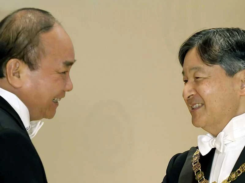 Nhà vua Nhật Bản Naruhito đón Thủ tướng Nguyễn Xuân Phúc. Ảnh: TTXVN