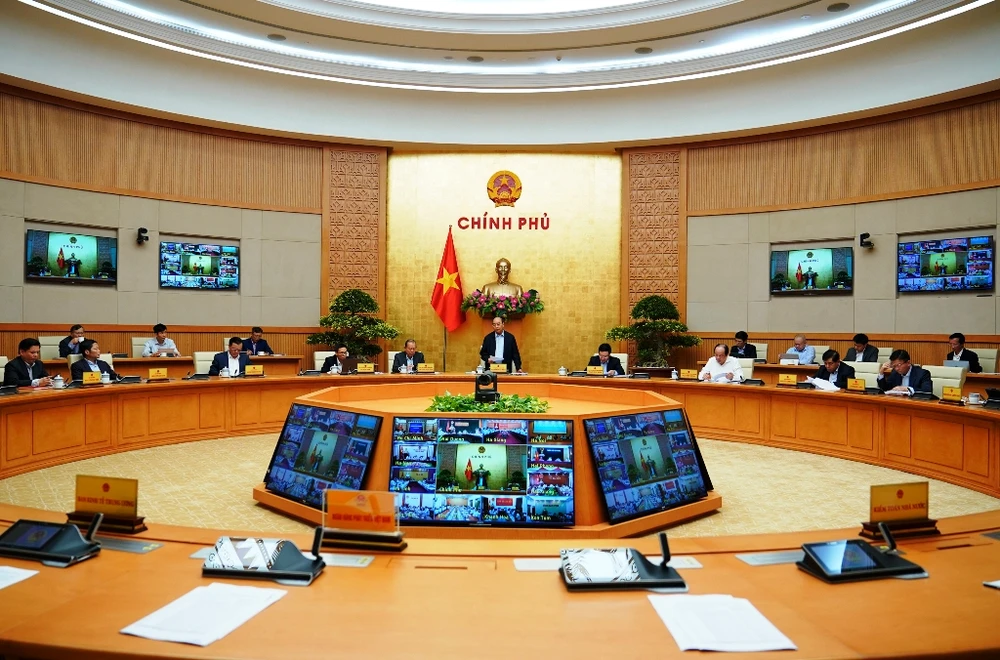 Thủ tướng Nguyễn Xuân Phúc chủ trì hội nghị trực tuyện với các bộ ngành, địa phương sáng nay. Ảnh: VGP/QUANG HIẾU