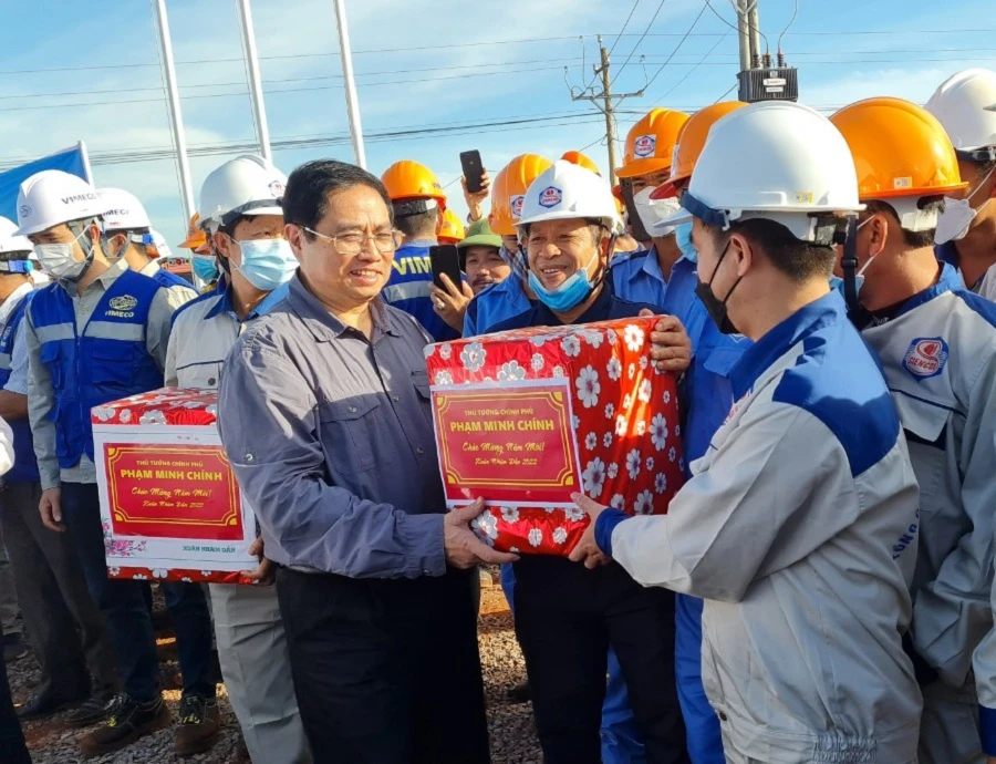 Thủ tướng Phạm Minh Chính thăm, tặng quà kỹ sư, công nhân đang thi công Dự án Cảng hàng không quốc tế Long Thành. Ảnh: VŨ HỘI.