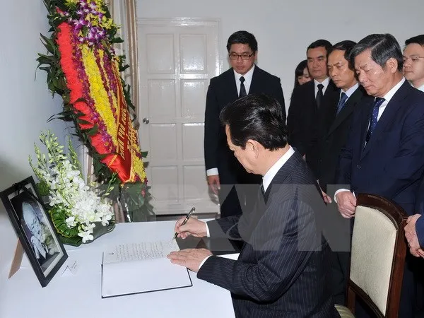 Thủ tướng Nguyễn Tấn Dũng đặt vòng hoa viếng và ghi sổ tang chia buồn việc nguyên Thủ tướng Singapore Lý Quang Diệu từ trần. (Ảnh: Trọng Đức/TTXVN)